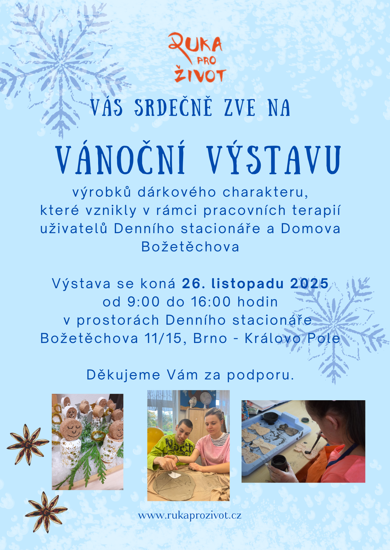 Srdečně Vás zveme na Vánoční výstavu výrobků dárkového charakteru, které vznikly v rámci pracovních terapií uživatelů Denního stacionáře a Domova Božetěchova v Brně.